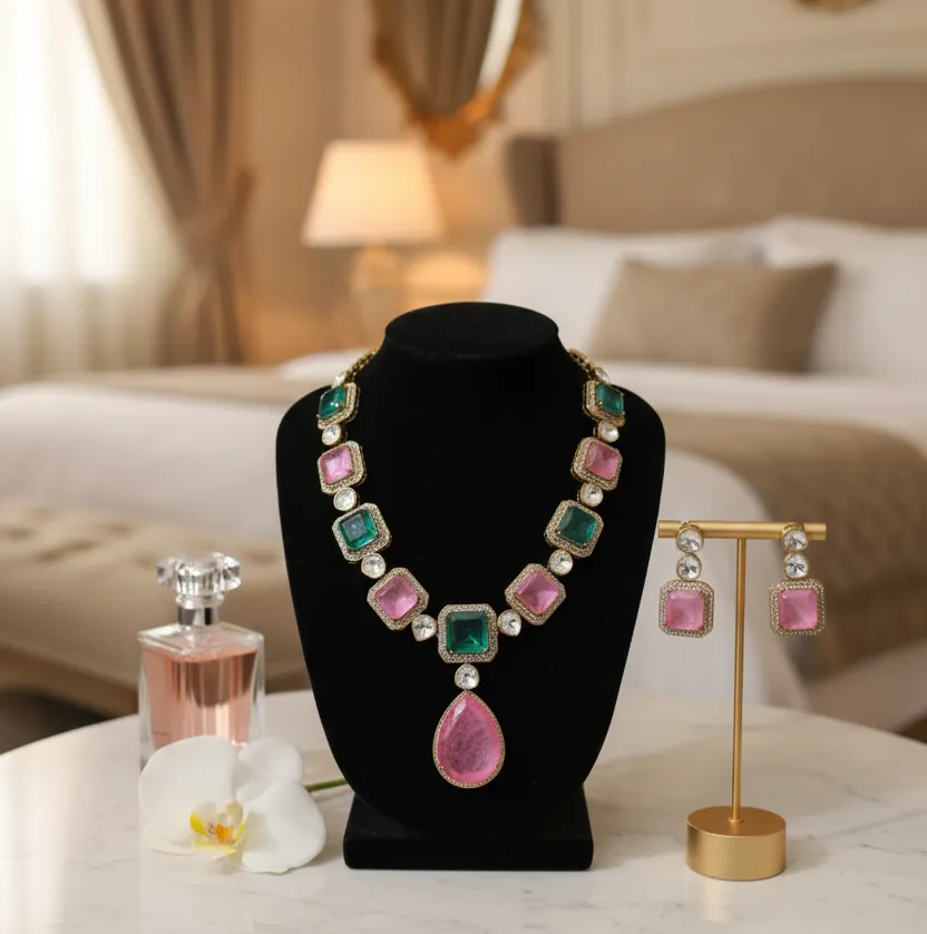 Designed in a harmonious blend of soft rose and deep emerald tones, this piece reflects balance — between grace and presence, tradition and modernity.