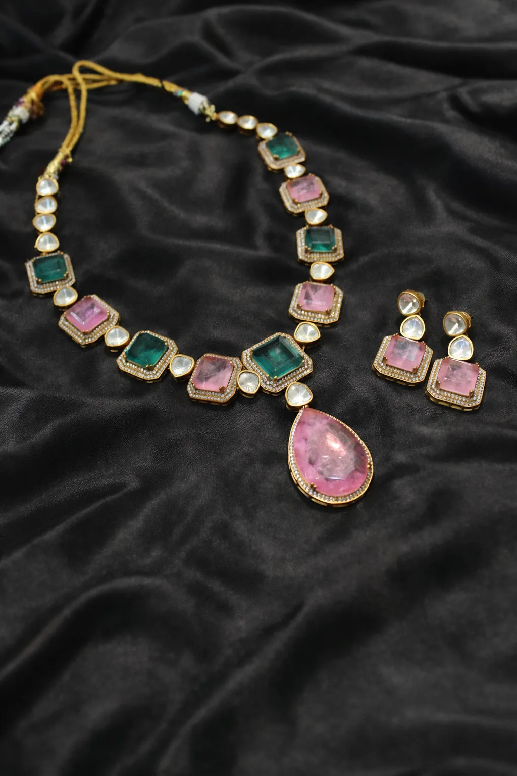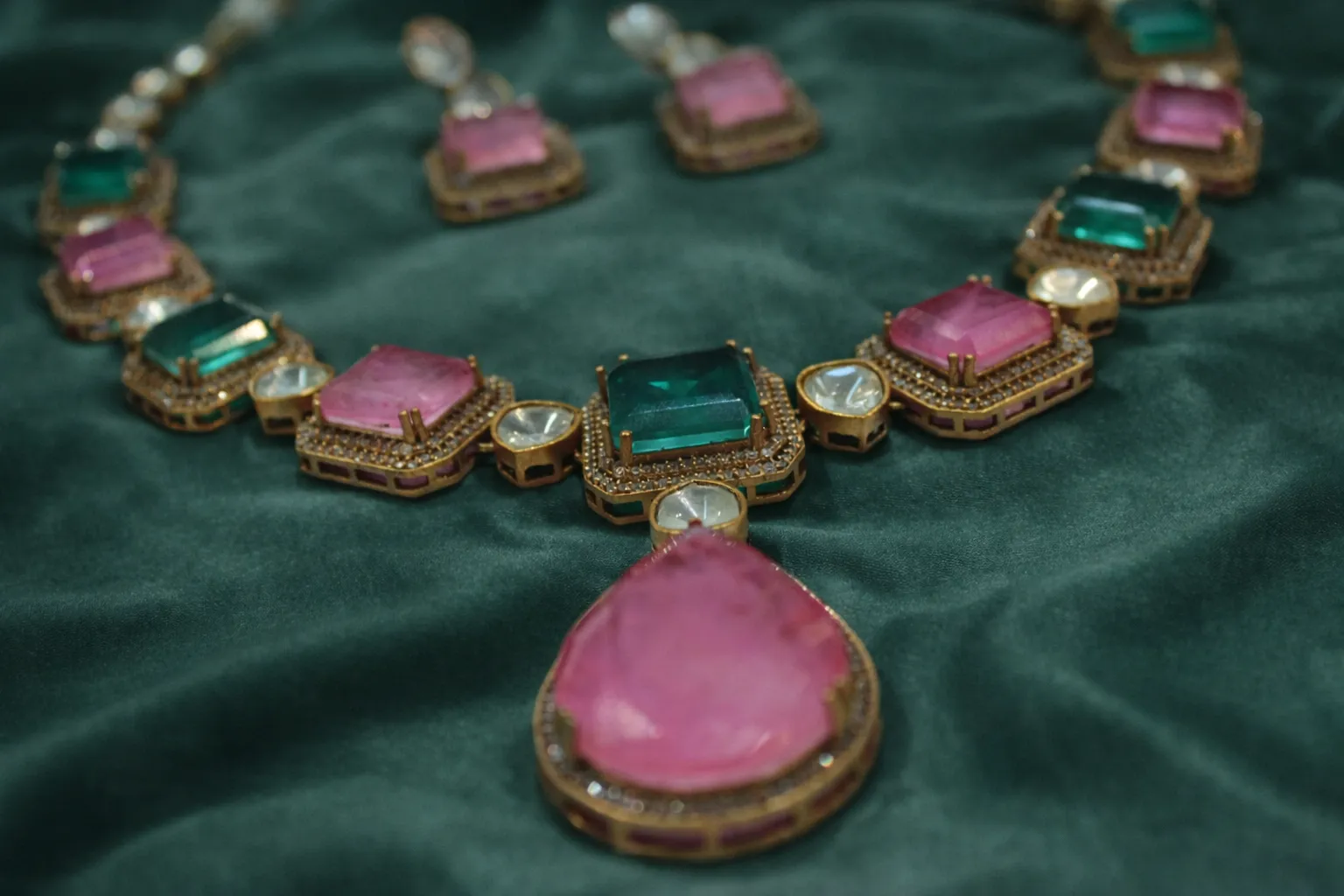 Each stone is thoughtfully set to create a fluid rhythm, allowing the necklace to sit beautifully while drawing the eye to its refined detailing. The central drop adds a subtle sense of drama, while the matching earrings complete the composition with quiet symmetry.