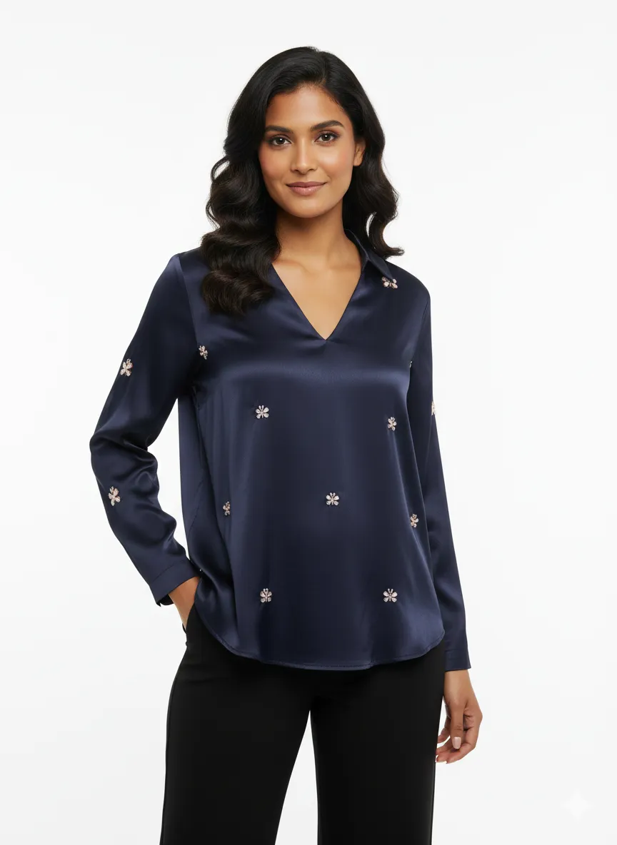 Midnight Flight is a graceful expression of movement, ease, and understated elegance. Crafted in fluid Armani silk, this dark blue top drapes effortlessly, offering a soft sheen that elevates everyday dressing.