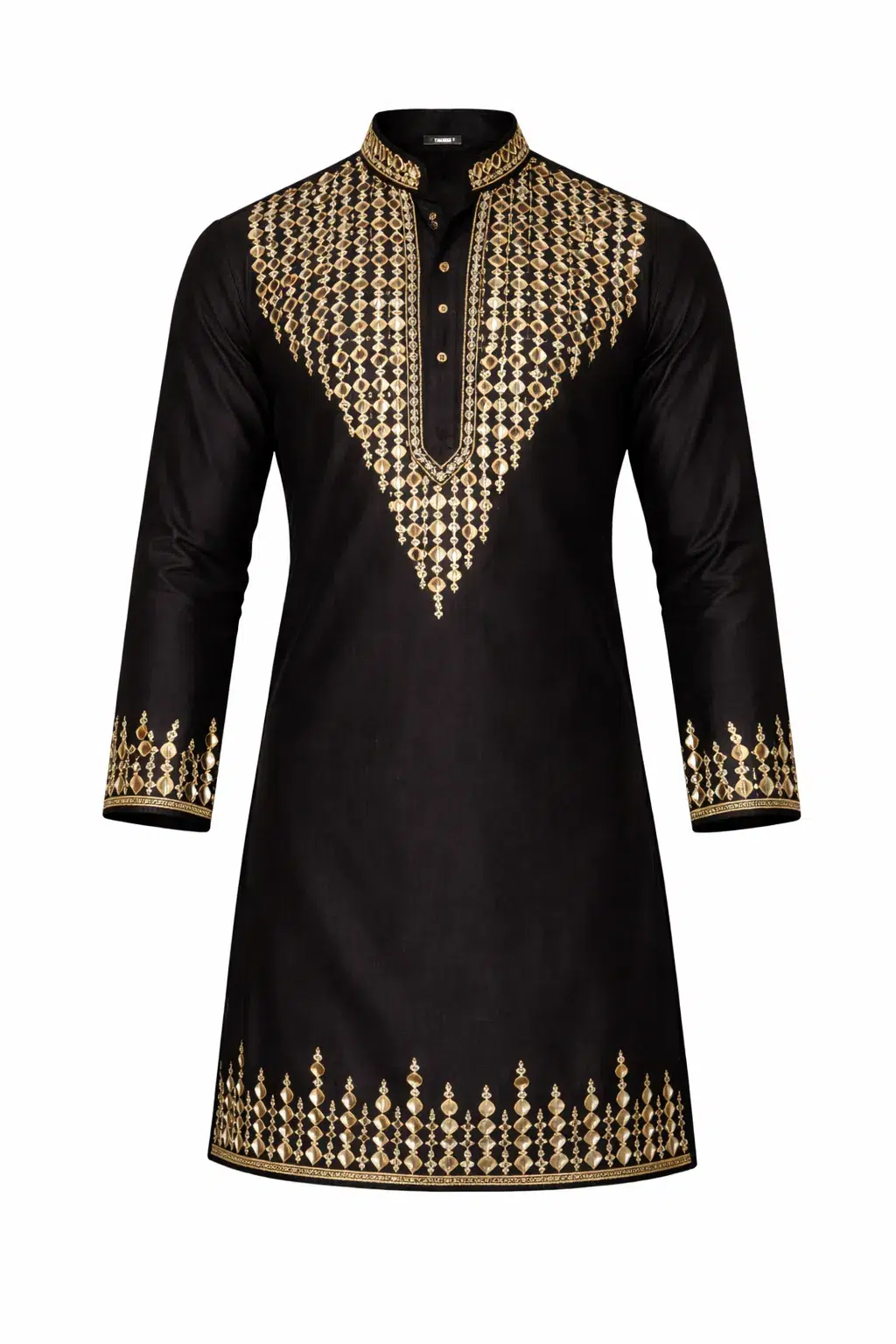 This design features dense hand mirror embroidery cascading in a regal V-formation from the neckline, framed in antique gold threadwork. The structured mandarin collar, detailed placket, embroidered cuffs, and coordinated hem border complete the silhouette with refined symmetry.