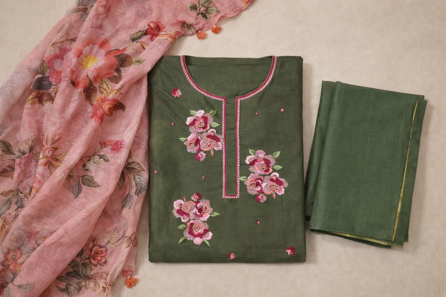 Quietly powerful and beautifully expressive, Olive Bloom is an ode to vintage charm and garden-soft romance. Rooted in the earthy depth of olive green and brought to life with playful pink florals, this ensemble balances strength with tenderness — effortlessly.